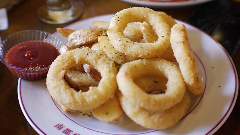 我們點了一杯啤酒、披薩、飯、洋蔥圈,大家share~