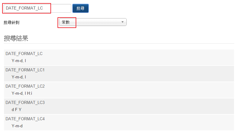 在搜尋框輸入 【DATE_FORMAT_LC】、下拉選單選擇【常數】,然後搜尋