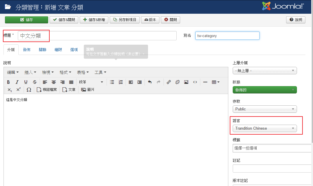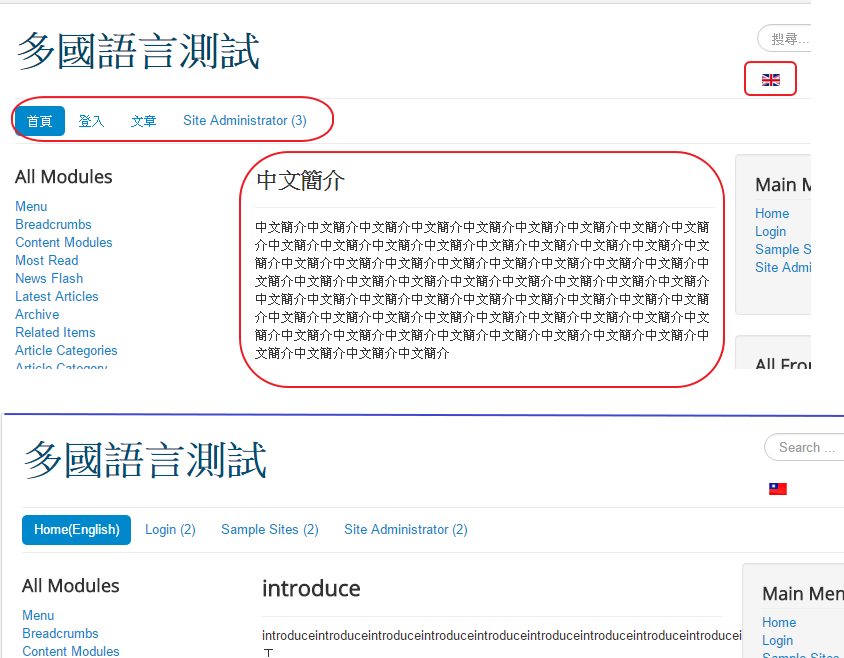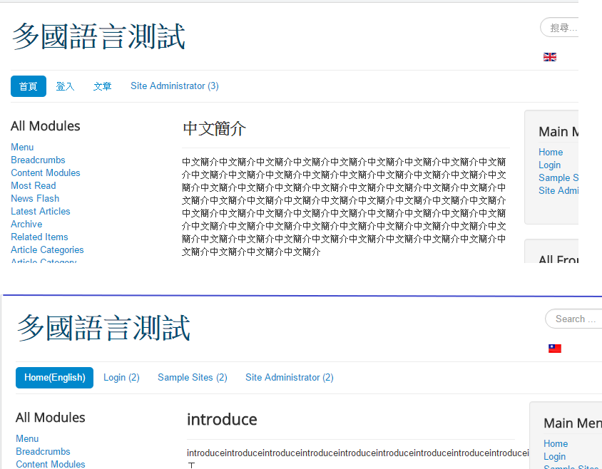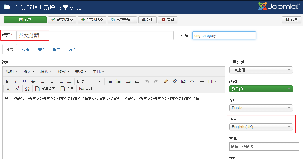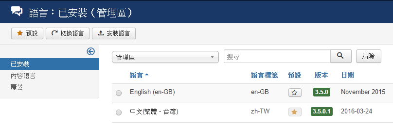 安裝完Joomla,預設語言為【繁體中文】,前台網站想要提供英文版切換。
