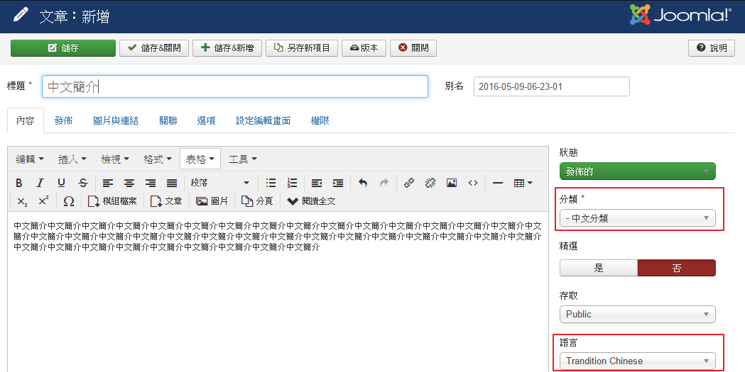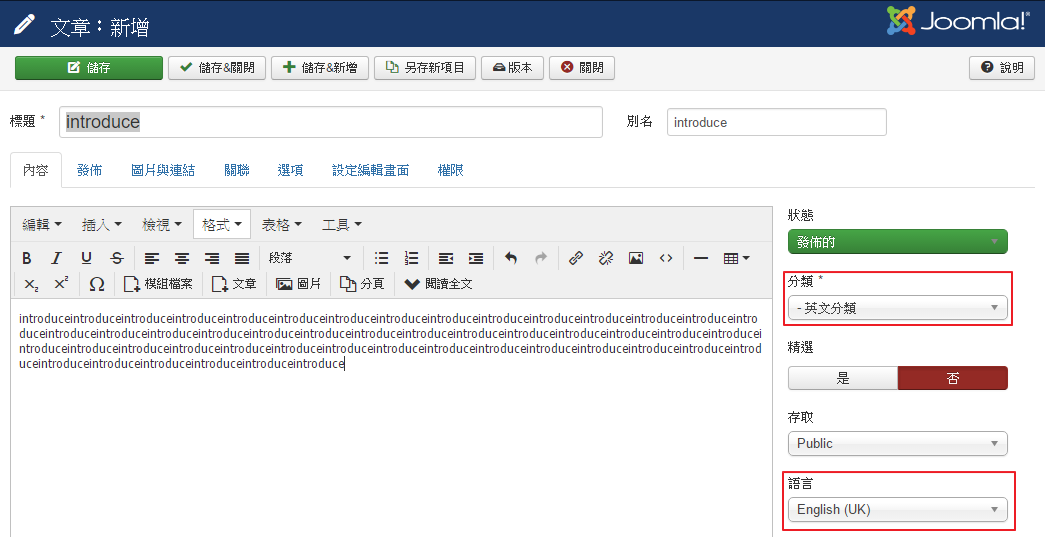 4. 內容 → 文章,分別建立中文/英文文章,並指定分類、語言