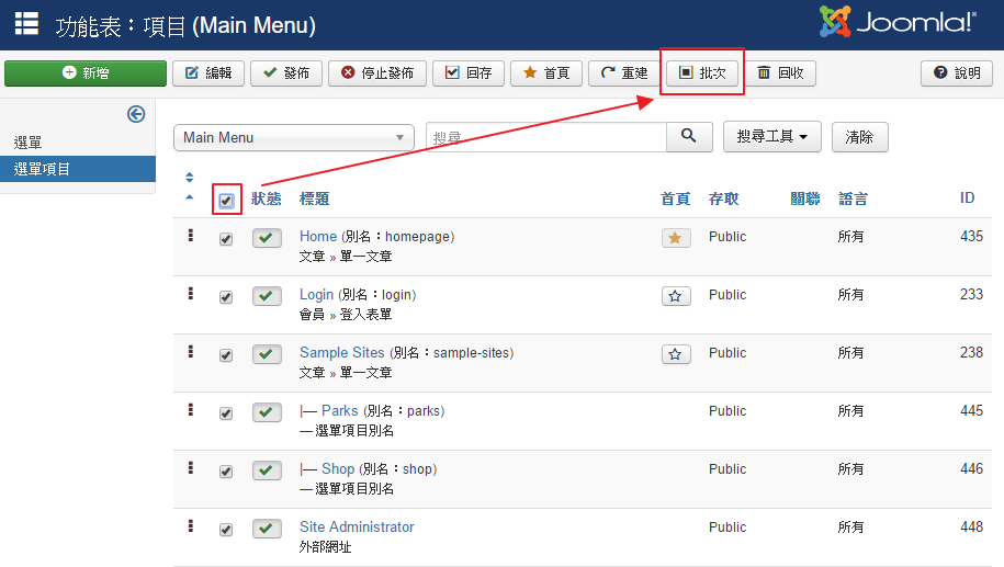 切換到Main Menu,勾選所有標題,點批次