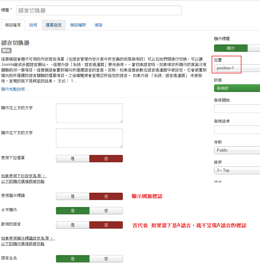 14. 到擴充套件 → 模組 → 新增 語言切換器,並指定要顯示的位置