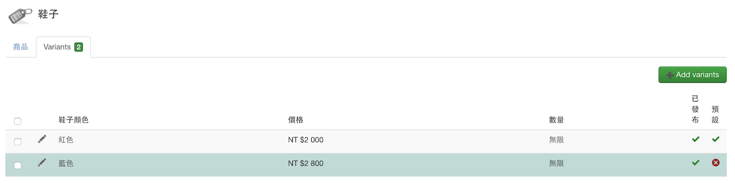 4. 第三步驟點完商品儲存後,最上方會出現 Variants