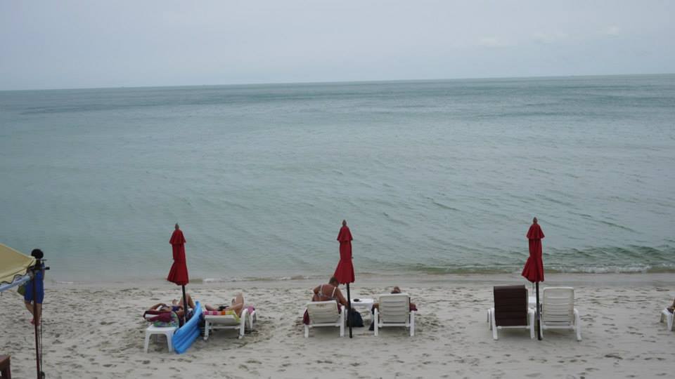 沙灘距離海水很近,可能擺了一些涼椅看起來更近